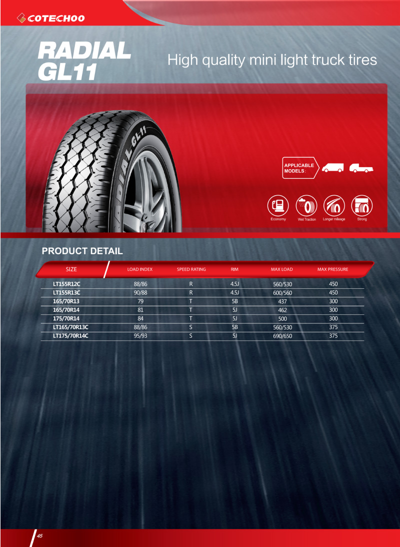 精品輕載輪胎,高強(qiáng)胎體結(jié)構(gòu),承載力更強(qiáng),耐磨橡膠配方和加深花紋,更高的使用壽命。