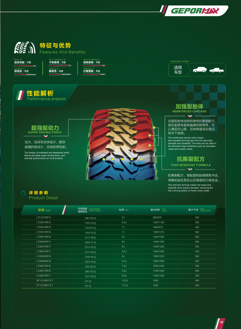 火焰型大塊花紋,是一款用于極限越野的輪胎,惡劣路況下提供超強(qiáng)的驅(qū)動(dòng)力、泥地防滑性能。