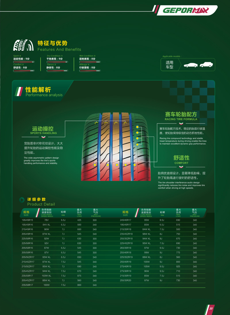 出眾的操控性能,運動型輪胎中不可多得的兼具舒適性,駕乘更流暢、更舒適。