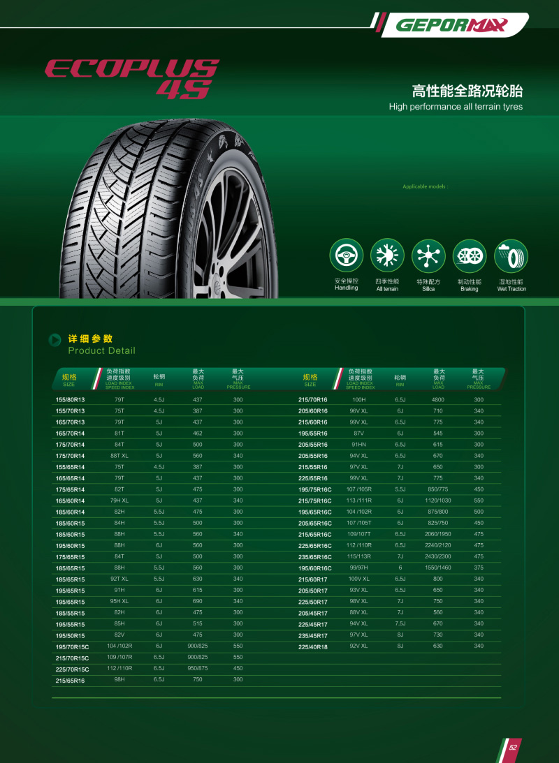 全季節(jié)輪胎,特殊胎面配方,適用雪泥地路況,有效防滑。