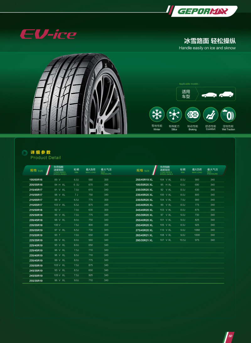 優(yōu)異的冰雪地操控性和駕駛性能;胎面使用特殊白炭黑配方,在低溫嚴(yán)寒環(huán)境中兼具低滾阻和優(yōu)秀濕滑性能。
