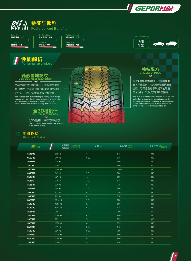 獨特胎面膠料配方及花紋,為輪胎提供良好的牽引力和制動性能,可保證在冬季氣候下的駕駛安全性能。