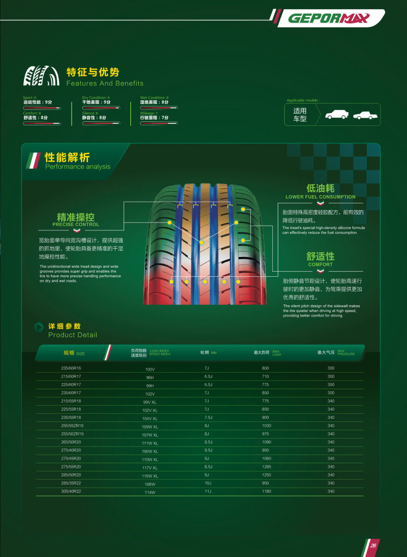 SUV專(zhuān)用輪胎,靜音胎面,超強抓地設計,精準操控。